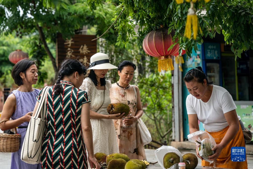 7月14日,游客在雲南省德宏傣族景頗族自治州芒市風平鎮帕底村介桃村民小組購買菠蘿蜜。