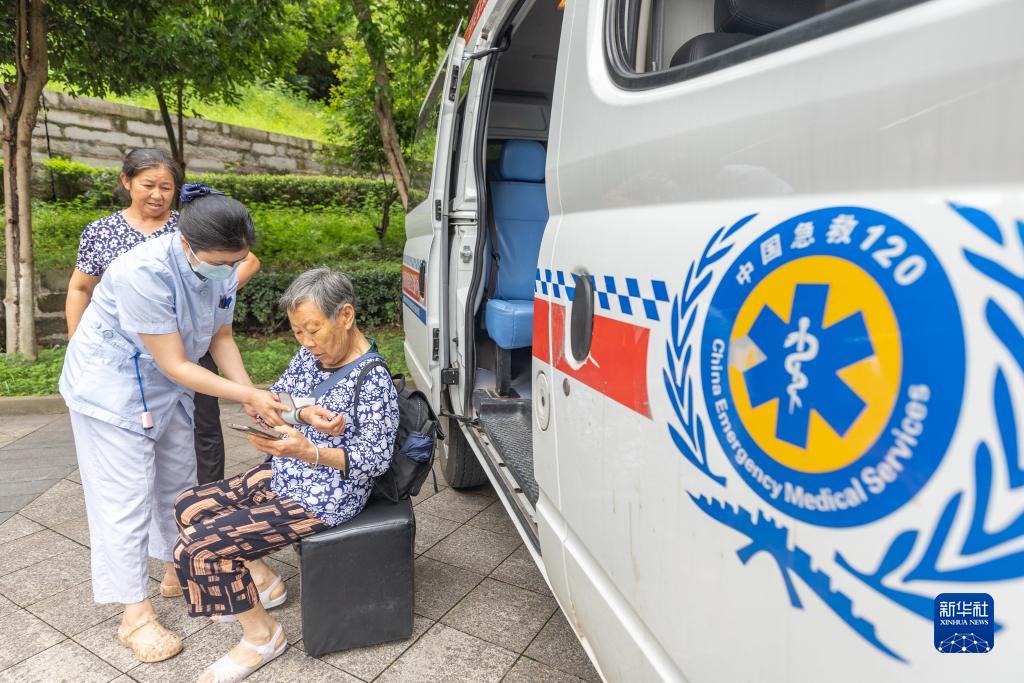 7月14日,在重慶市萬州三中江南校區臨時安置點內,醫護人員為轉移安置人員測量血壓。
