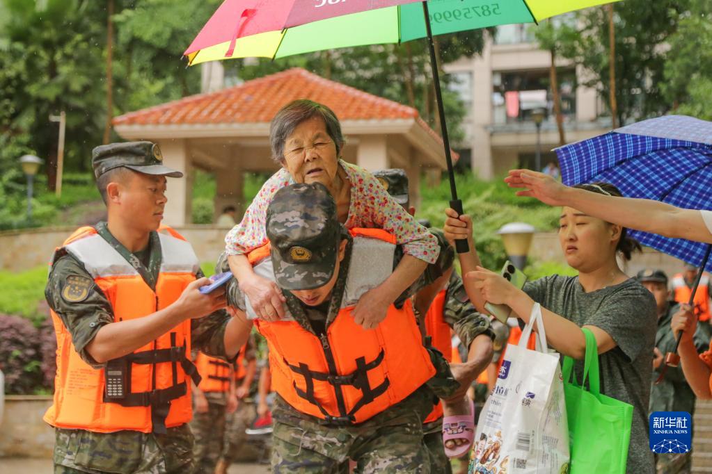 7月14日,在重慶市萬州區江南新區,武警重慶總隊執勤第三支隊官兵在轉移群眾。