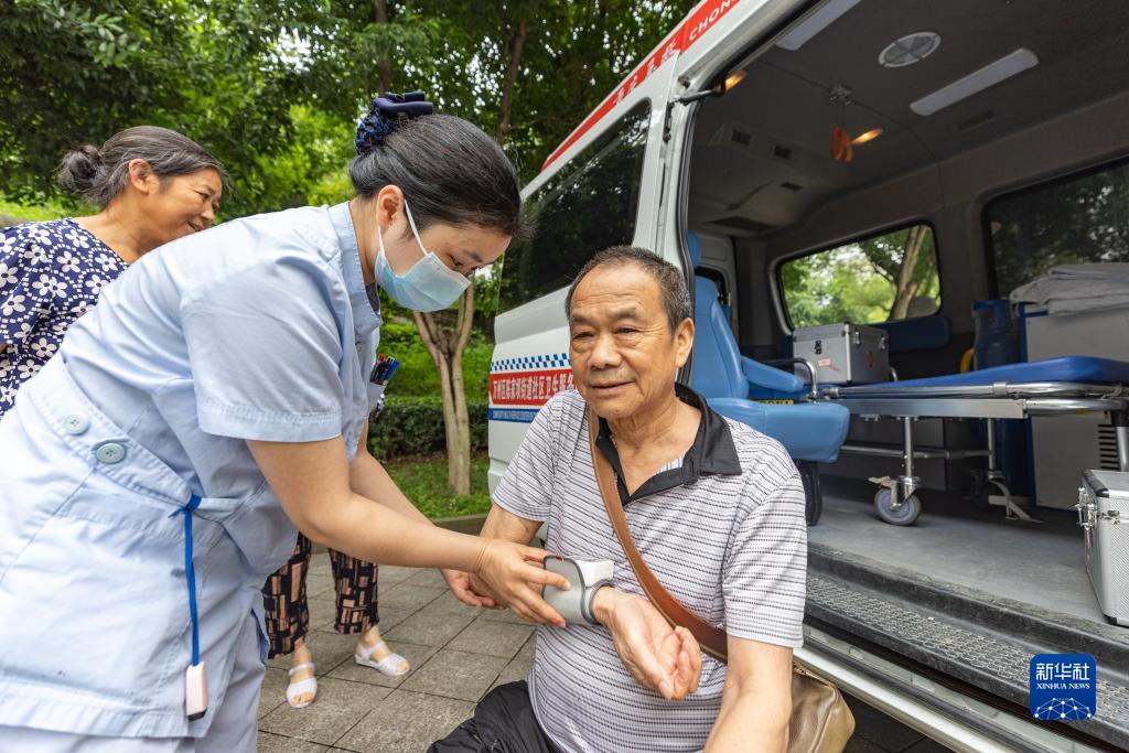 7月14日,在重慶市萬州三中江南校區臨時安置點內,醫護人員為轉移安置人員測量血壓。