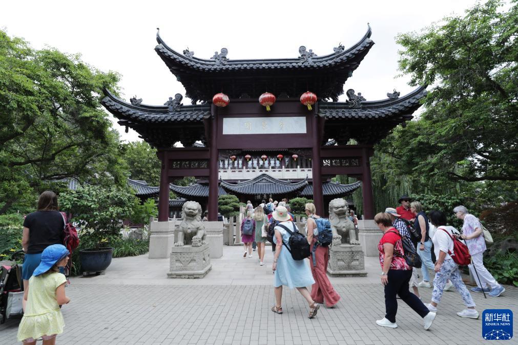 7月14日,游客在德國曼海姆的路易森公園內參觀中國園林“多景園”。