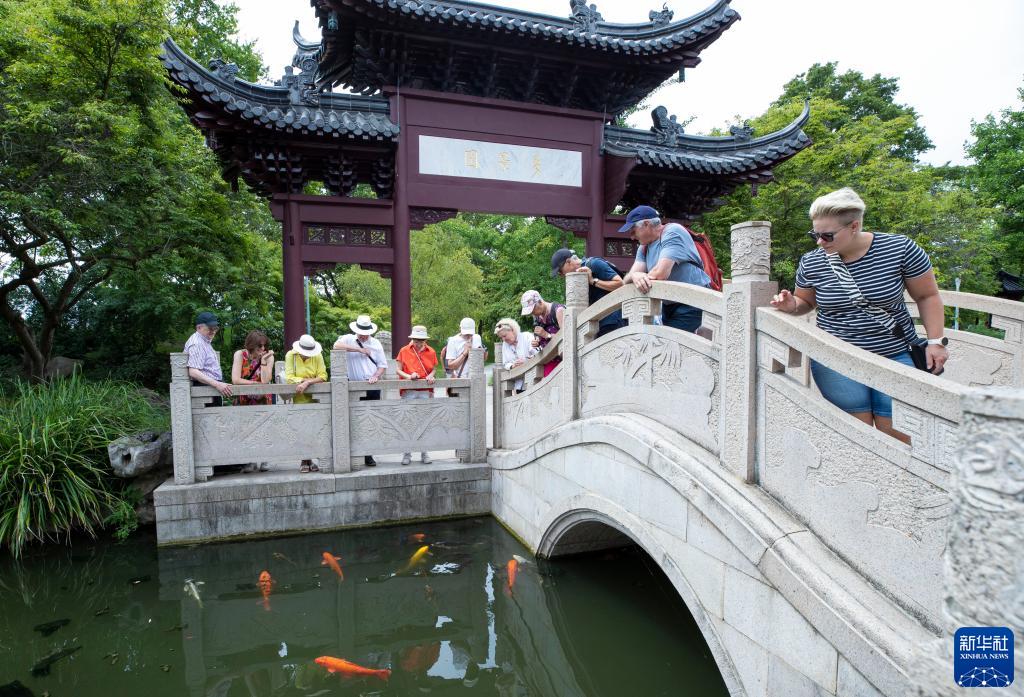 7月14日,游客在德國曼海姆的路易森公園內參觀中國園林“多景園”。