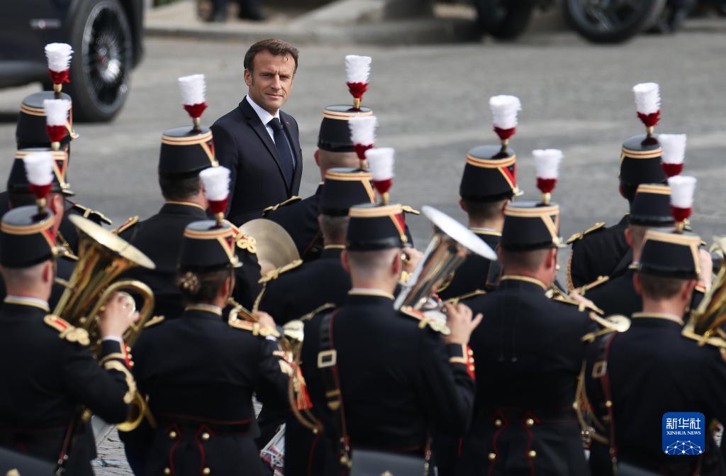 7月14日,法國總統馬克龍在巴黎協和廣場的國慶閱兵式現場檢閱儀仗隊。新華社記者 高靜 攝