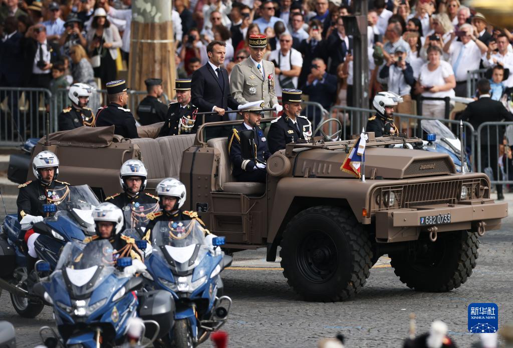 7月14日,法國總統馬克龍抵達巴黎協和廣場的國慶閱兵式現場。新華社記者 高靜 攝