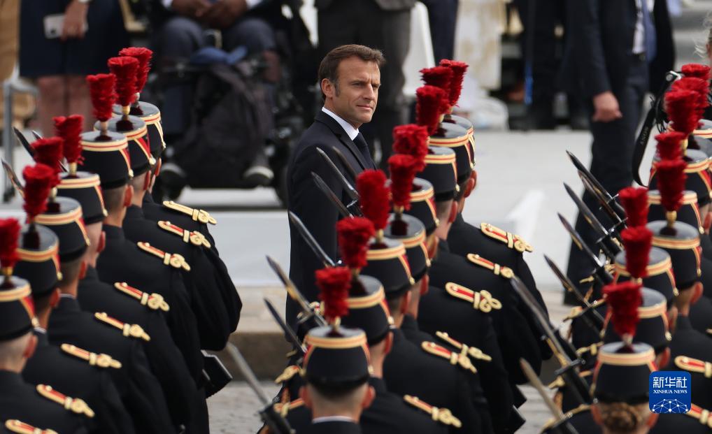 7月14日,法國總統馬克龍在巴黎協和廣場的國慶閱兵式現場檢閱儀仗隊。新華社記者 高靜 攝