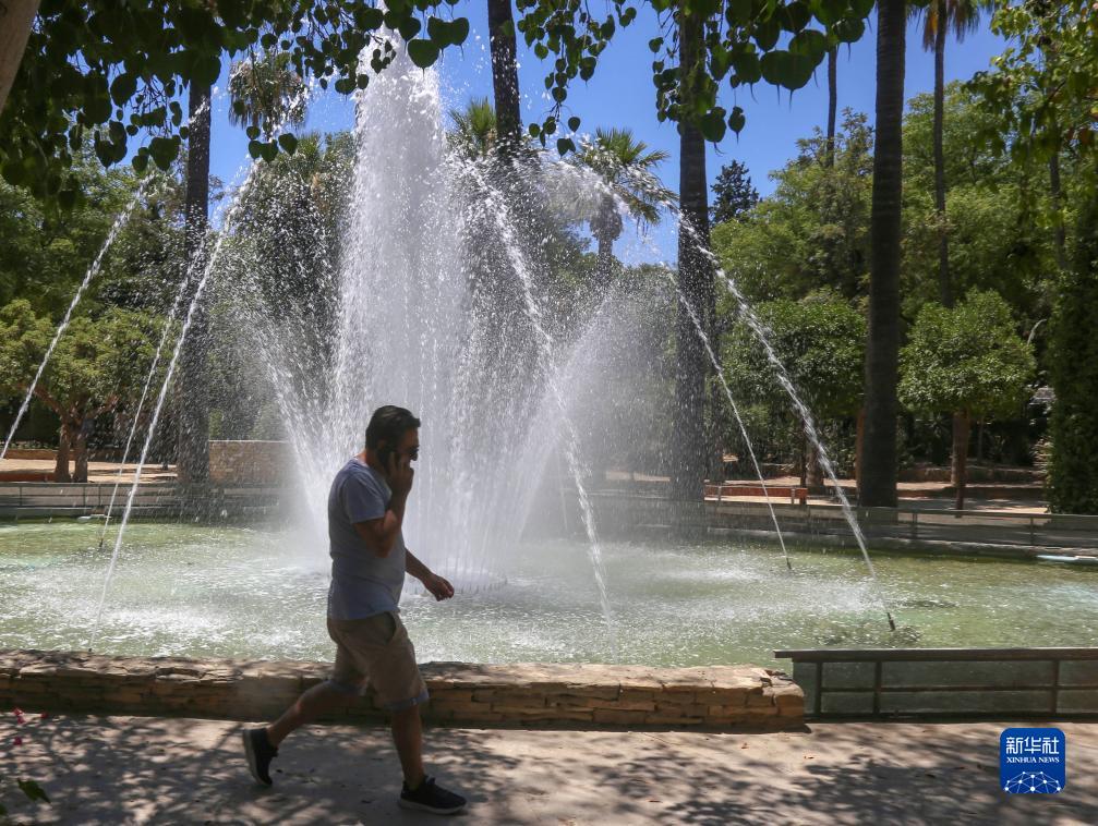 7月14日,在塞浦路斯尼科西亞一處公園,一名男子經過一座噴泉。新華社發(喬治·克裏斯托弗魯攝)