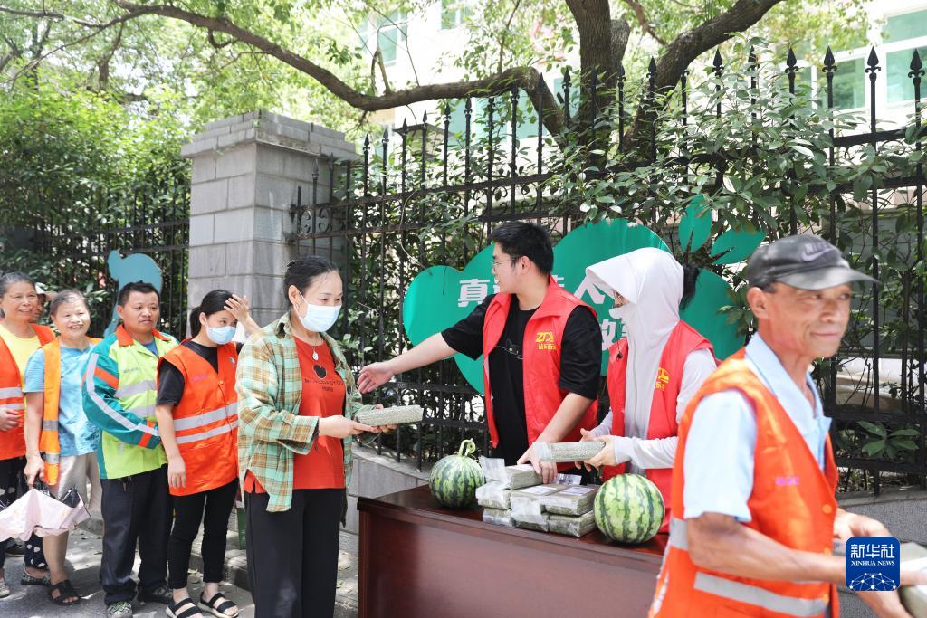 在江西南昌青山湖區站東街道,環衛工人領取防暑降溫物品(7月14日攝)。