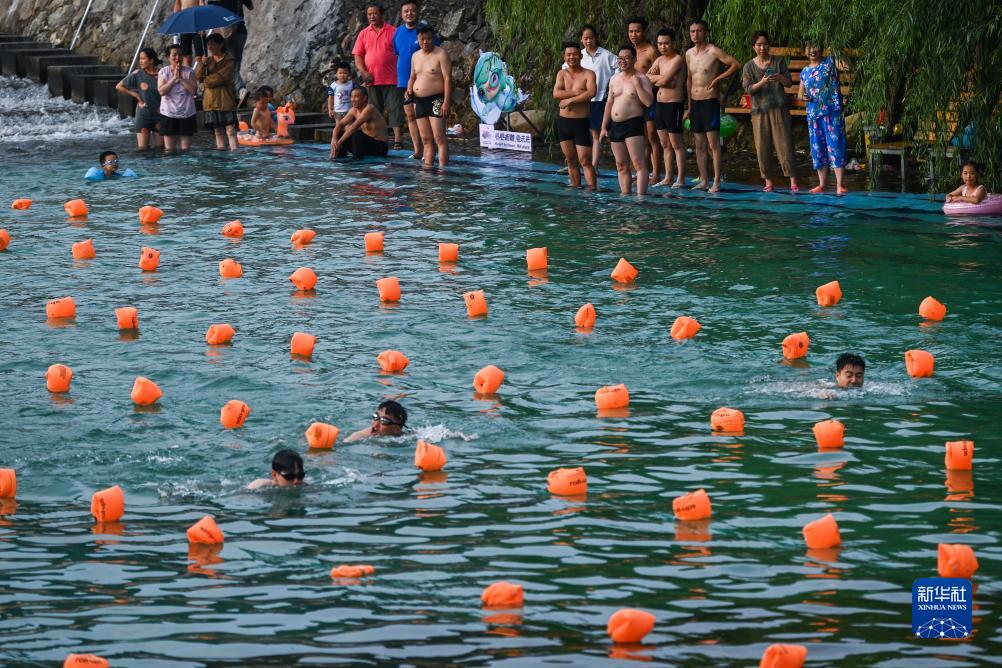 7月14日,村民在乾潭鎮下包村胥溪天然泳場參加趣味比賽。