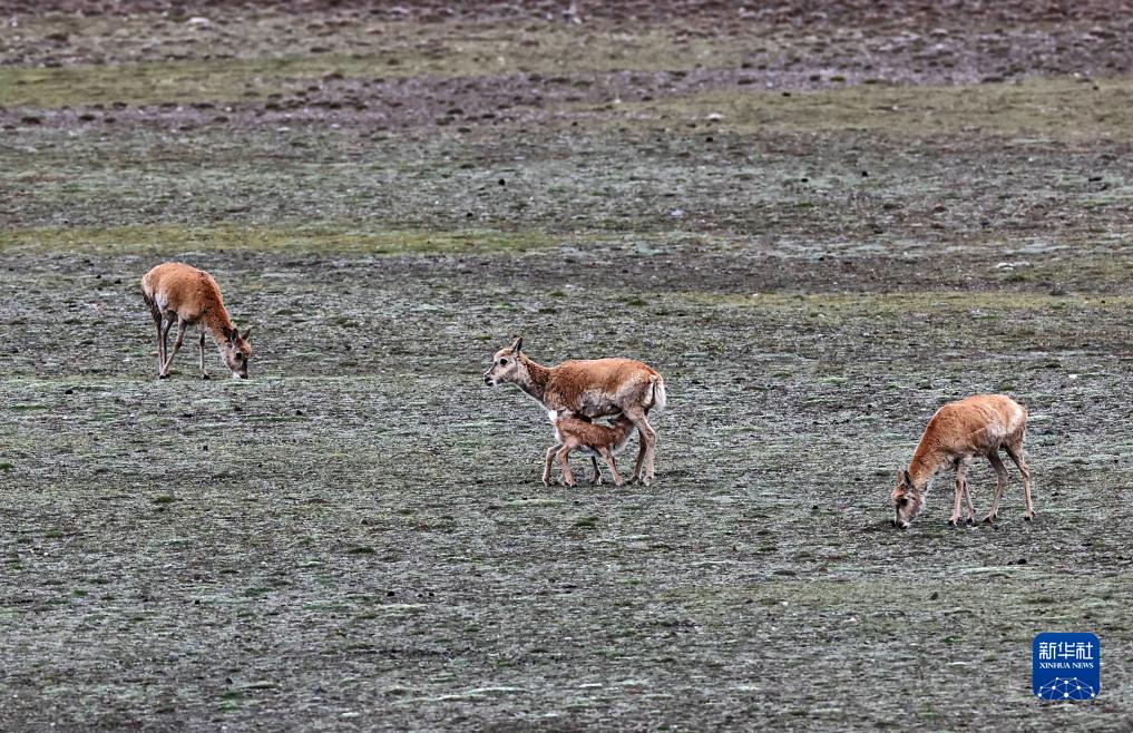 7月8日,在新疆阿爾金山國家級自然保護區兔子湖地區,藏羚羊媽媽給幼崽喂奶。