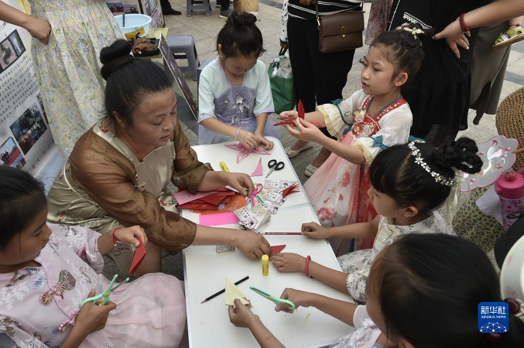 7月14日傍晚,小朋友在開封市開元廣場設立的“非遺市集”現場體驗剪紙技藝。