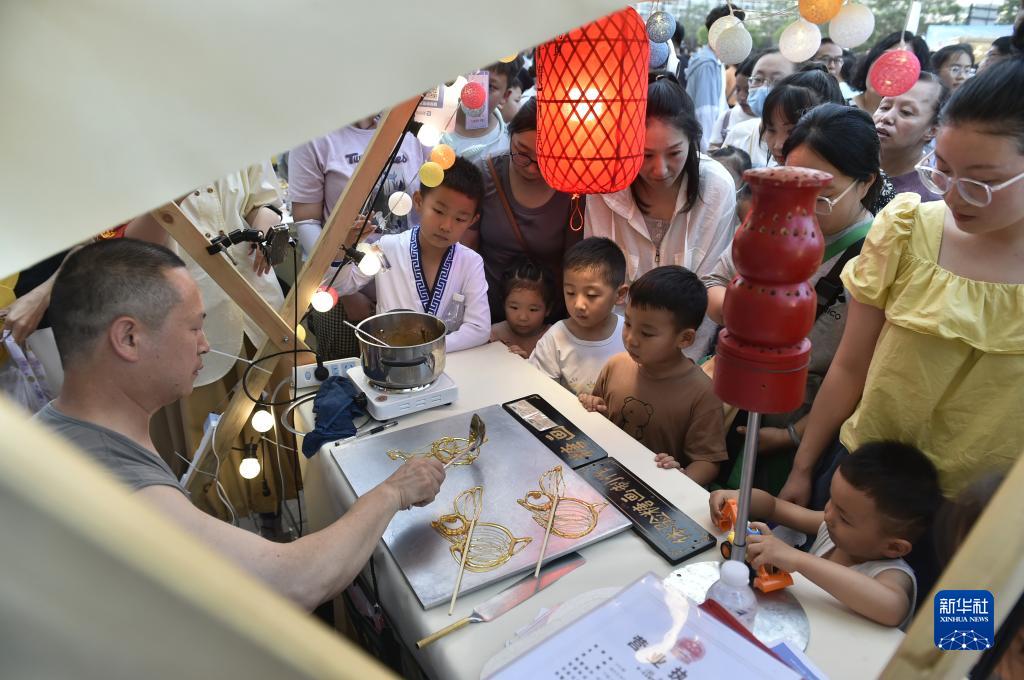 7月14日傍晚,工作人員在開封市開元廣場設立的“非遺市集”現場展示糖畫製作技藝。