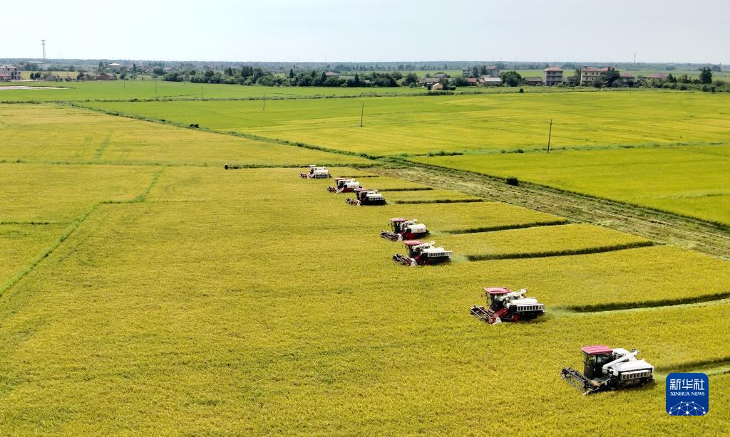 在江西省南昌縣塘南鎮北聯村,多&&合收割機在田間穿梭,搶收稻穀(7月13日攝,無人機照片)。