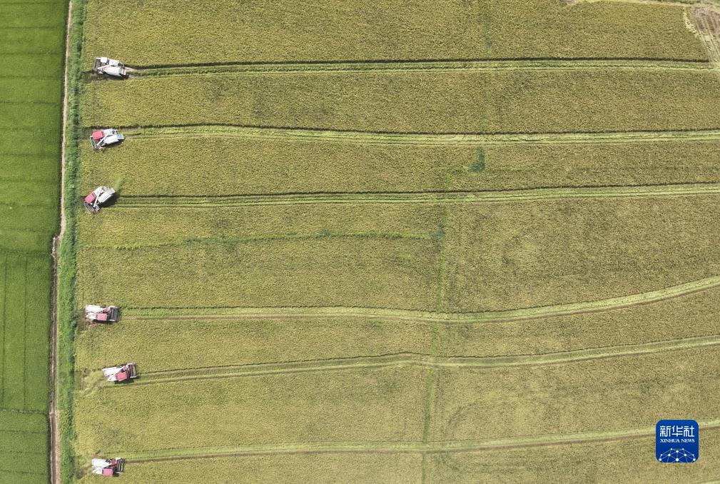 在江西省南昌縣塘南鎮北聯村,多&&合收割機在田間穿梭,搶收稻穀(7月13日攝,無人機照片)。