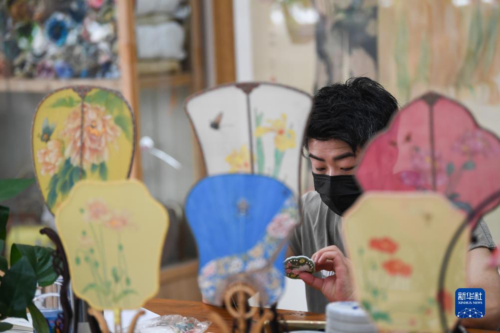 7月14日,在開封博物館,一位汴繡技師展示汴繡製作技藝。
