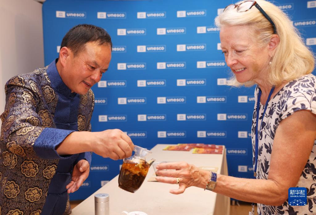 7月11日,在位於法國巴黎的聯合國教科文組織總部,嘉賓品嘗南京雨花茶。