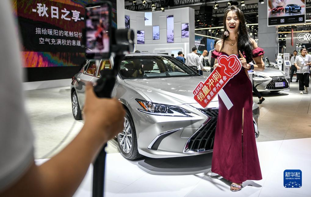 7月15日,一名工作人員在長春汽博會現場錄製短視頻。