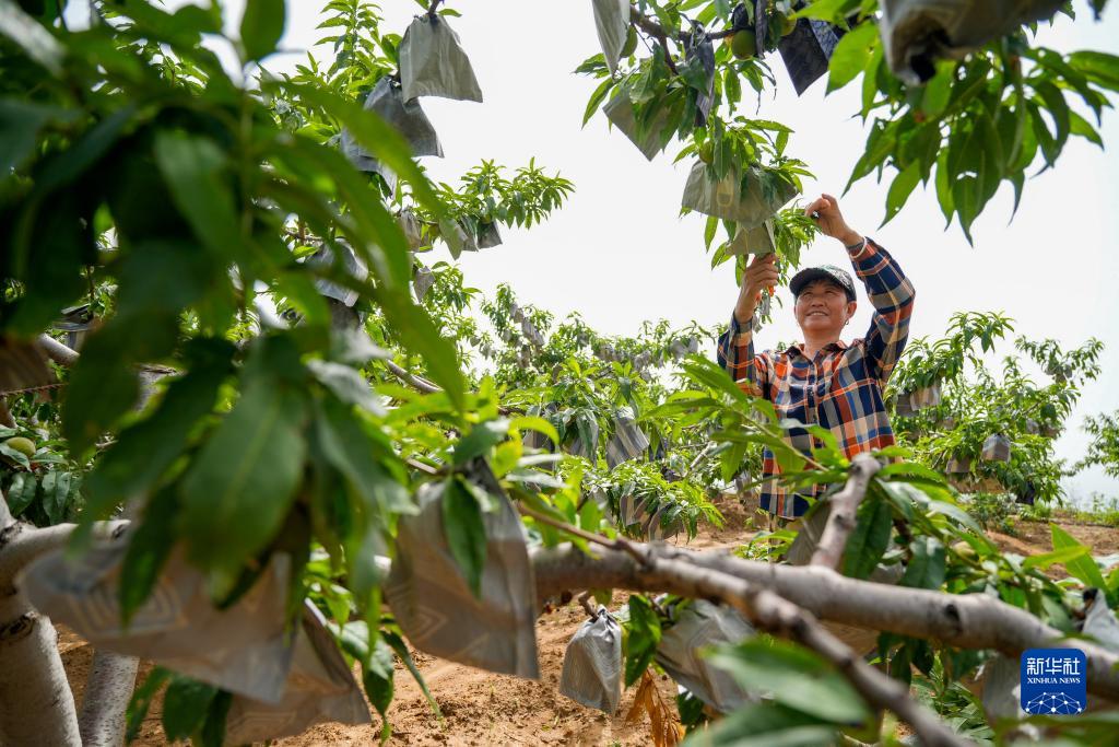 7月14日,工人在河北省唐山市古冶區一處修復礦山後建成的果園內打理果樹。