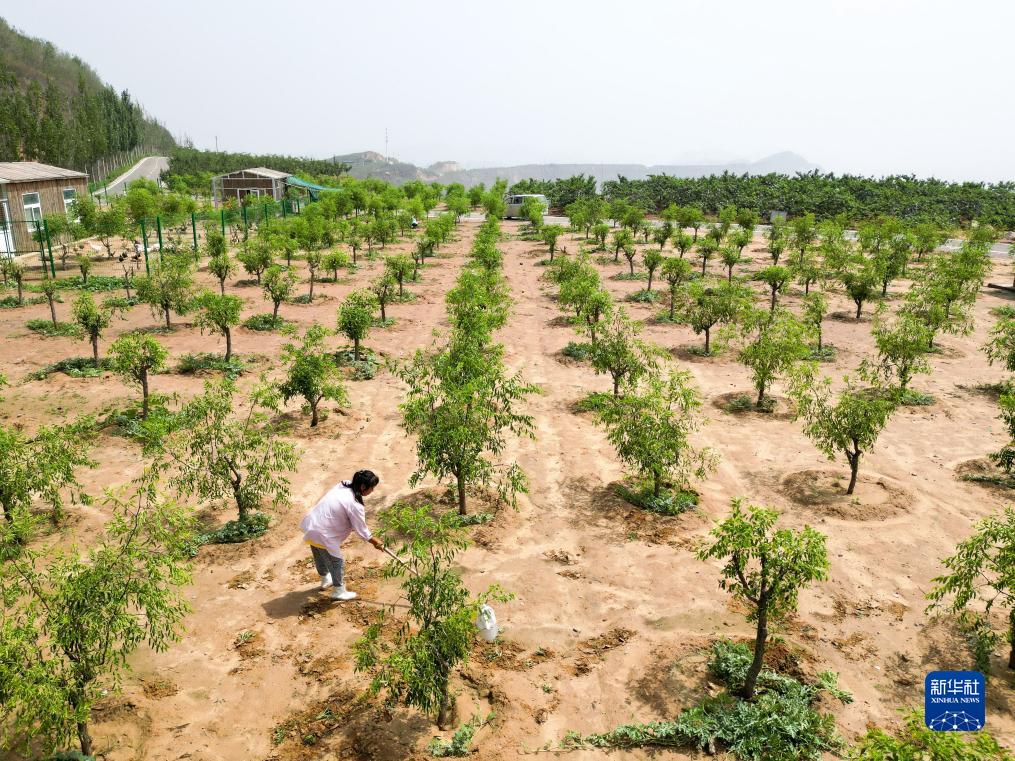7月14日,工人在河北省唐山市古冶區一處修復礦山後建成的果園內打理果樹(無人機照片)。