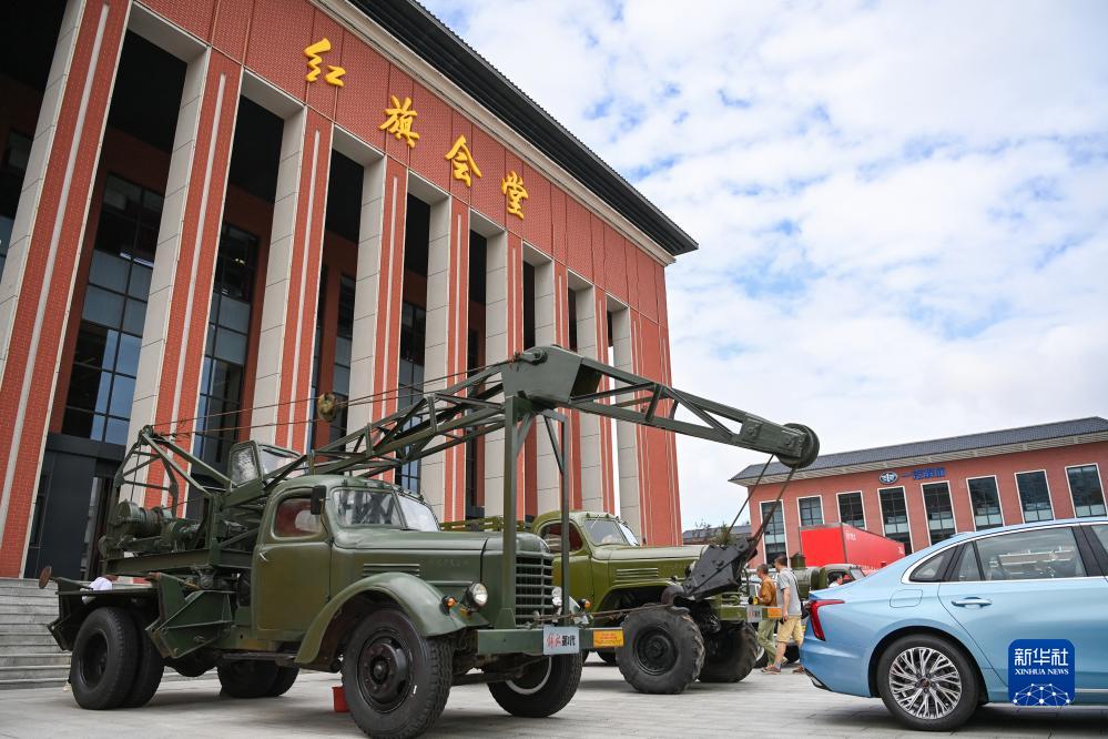 7月15日,在位於吉林長春的紅旗會堂前,市民觀賞展出的解放汽車。