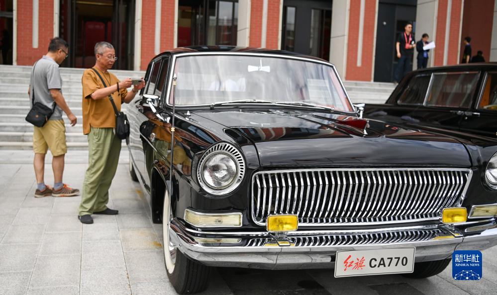 7月15日,市民在位於吉林長春的紅旗會堂前觀賞展出的紅旗汽車。