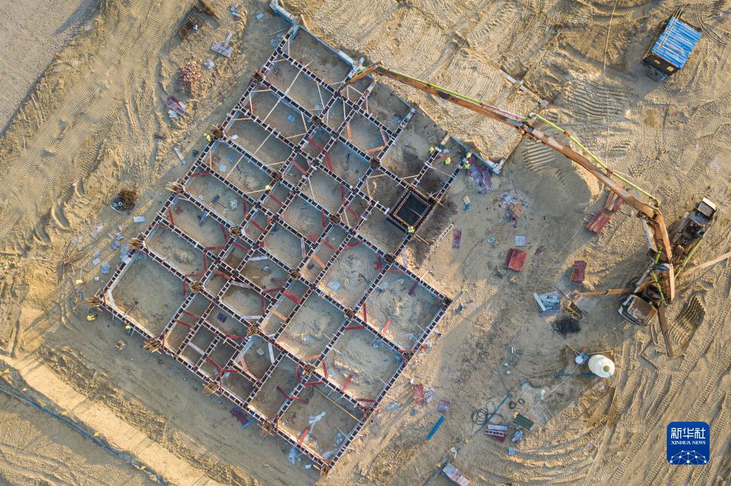 7月14日,工人在文昌鋪前中心漁港項目施工(無人機照片)。