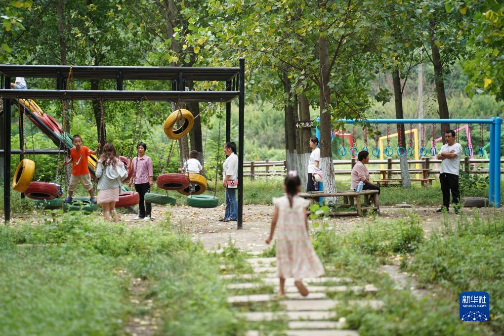 7月14日,在周至縣駱峪鎮駱峪村一處兒童游樂設施內,小朋友在家長的陪同下玩耍。