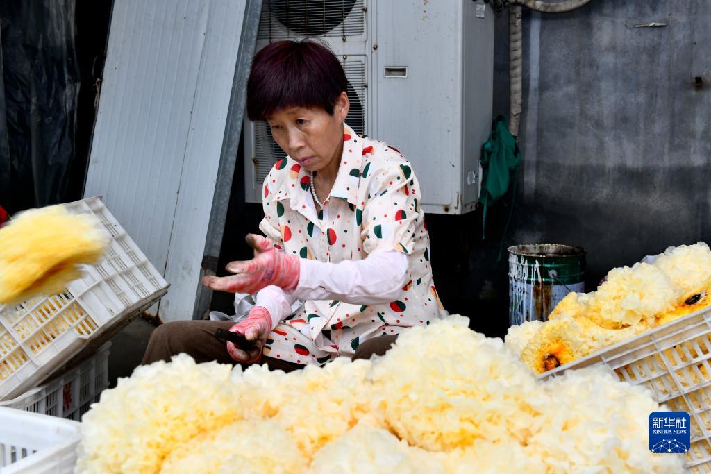 7月15日,在惠民縣胡集鎮銀豐食用菌種植合作社,工作人員在整理新採摘的銀耳。