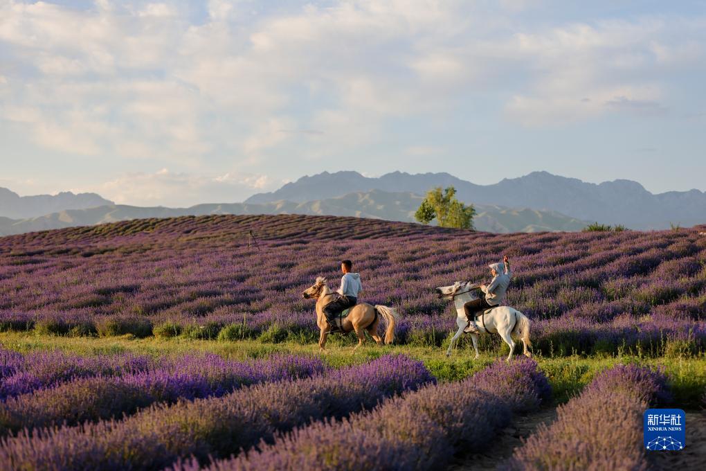 游客在霍城縣蘆草溝鎮四宮村解憂公主薰衣草農場騎馬游玩(7月14日攝)。