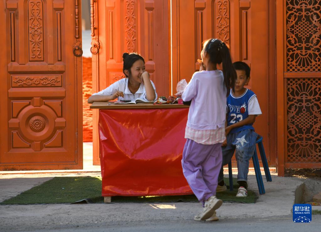 幾名小朋友在霍城縣蘆草溝鎮四宮村巷子裏玩耍(7月13日攝)。