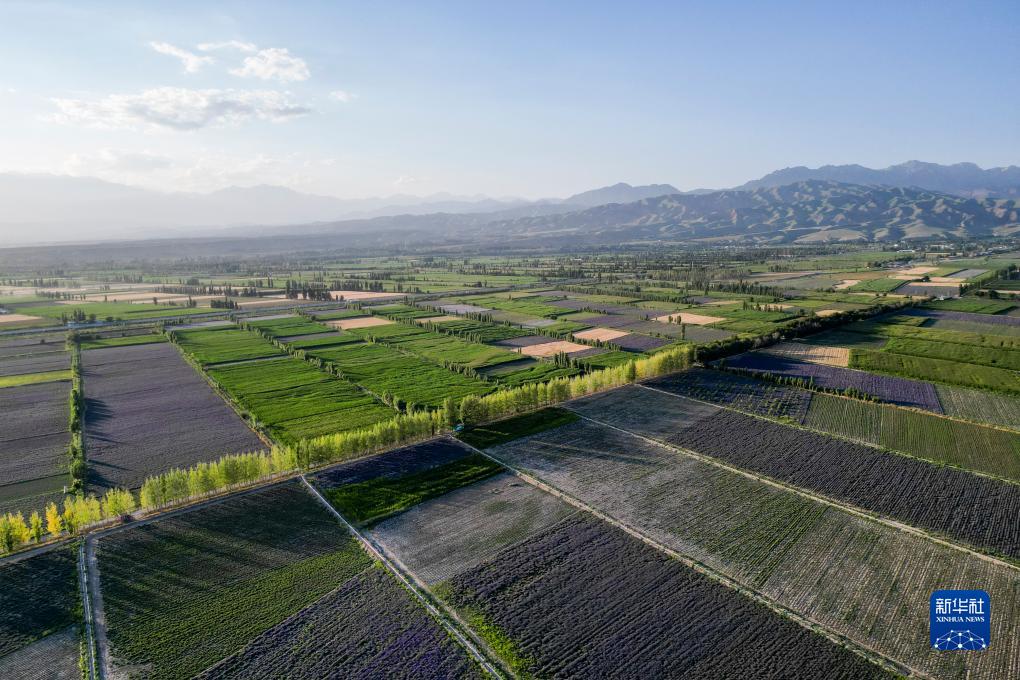 這是霍城縣蘆草溝鎮四宮村的薰衣草花田(無人機照片,7月12日攝)。