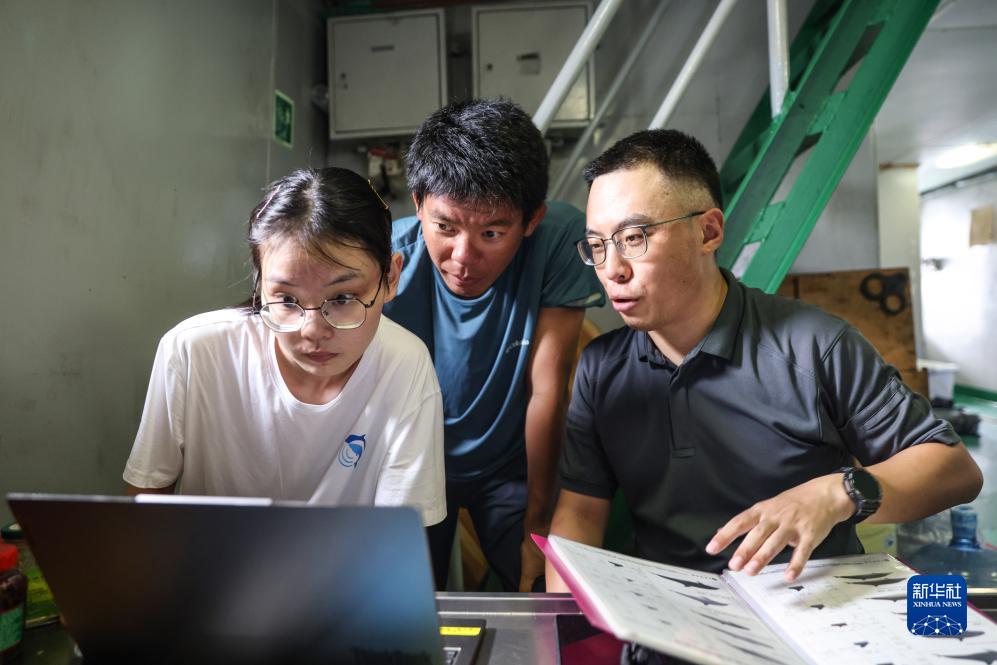 6月30日,第六次南海深潛及遠海鯨類科考航次的科研人員在分析鯨類動物照片。