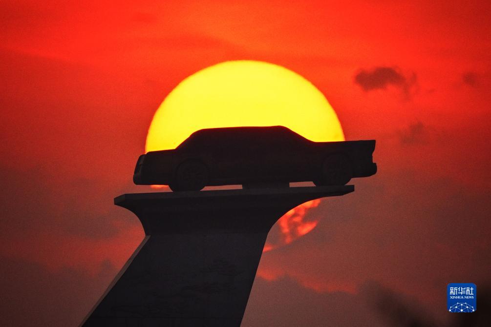 吉林省長春市汽車廣場內的汽車雕塑沐浴在晨曦中(6月17日攝)。