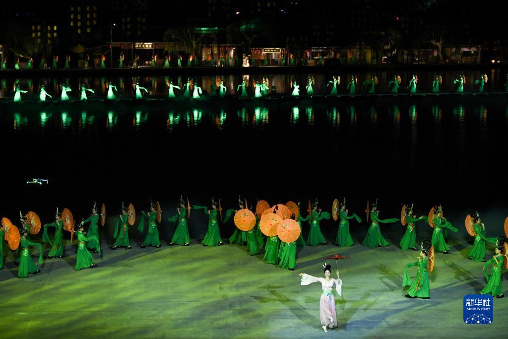 7月14日,演員在開封清明上河園景區內演繹大型水上實景演出《大宋·東京夢華》。新華社記者 吳剛 攝