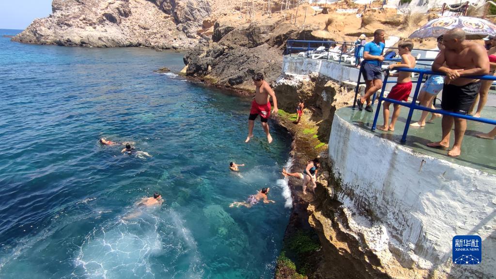 這是2022年7月21日,人們在阿爾及利亞第二大城市奧蘭的海濱休閒。
