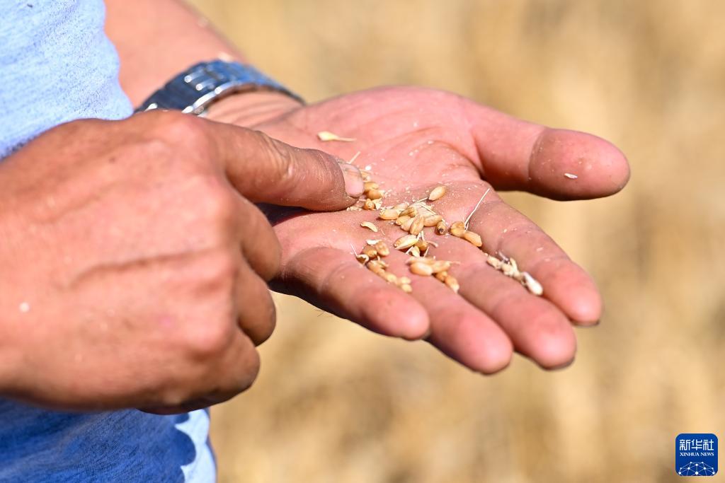 新疆呼圖壁縣五工&鎮小泉村的糧農查看收穫的小麥(7月15日攝)。