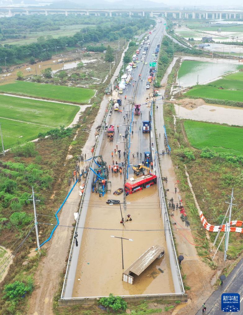 7月16日,在韓國忠清北道清州市,救援人員進行抽水和搜救作業(無人機照片)。