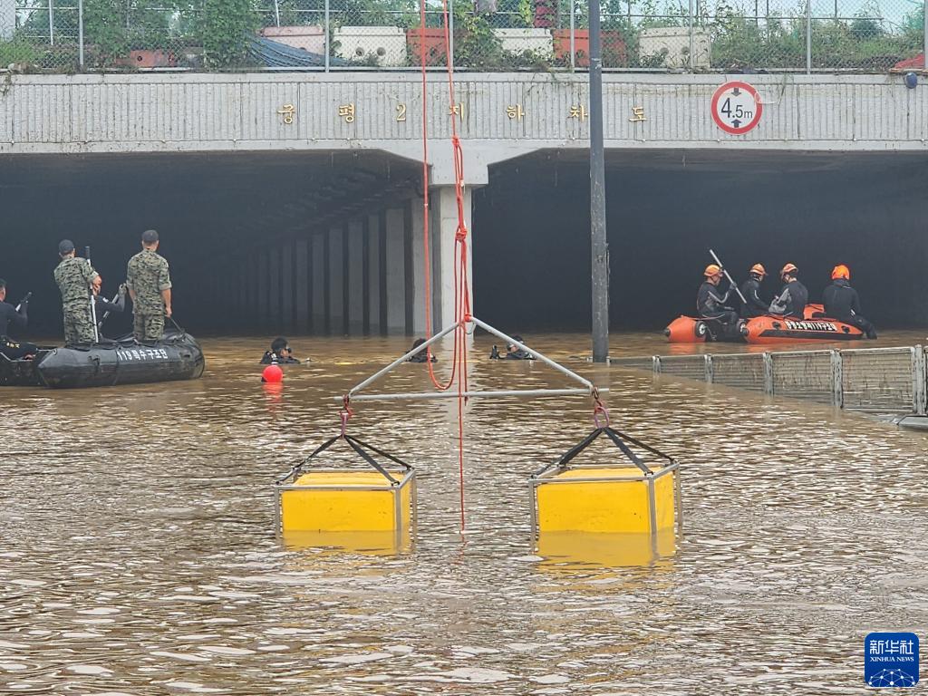 7月16日,在韓國忠清北道清州市,救援人員在被水淹沒的地下車道進行搜救工作。