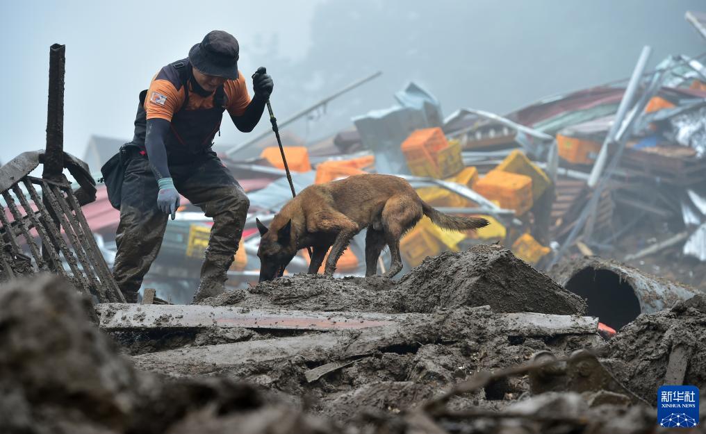 7月16日,在韓國慶尚北道醴泉郡,救援人員在因暴雨引發山體滑坡的村莊內搜救。