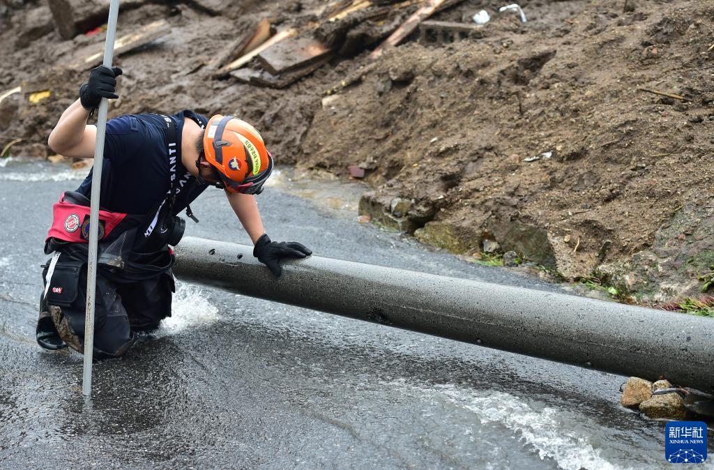 7月16日,在韓國慶尚北道醴泉郡,一名救援人員在搜救中途短暫休整。