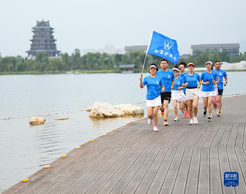 在成都市龍泉驛區東安湖體育公園,杜以萍(左一)帶領跑團成員跑步(7月12日攝)。