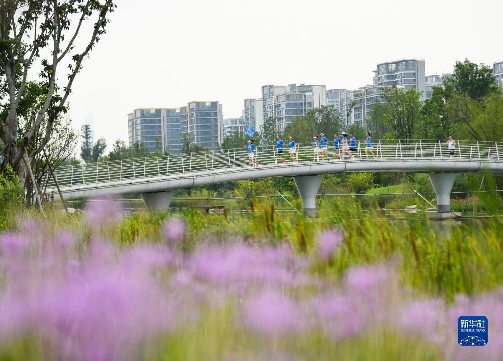 在成都市龍泉驛區東安湖體育公園,杜以萍(左一)帶領跑團成員跑步(7月12日攝)。