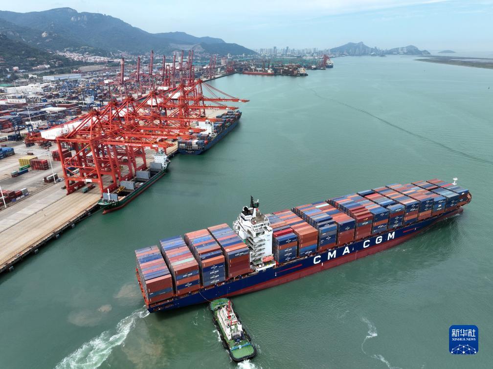 7月16日,在江蘇連雲港港集裝箱碼頭,貨輪滿載集裝箱駛離泊位(無人機照片)。