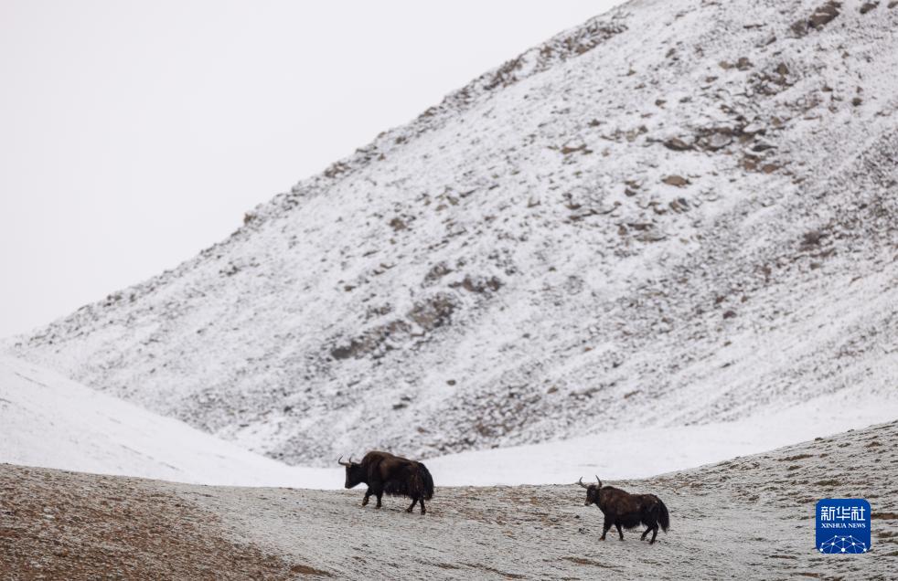 7月2日,在新疆阿爾金山國家級自然保護區,兩隻野牦牛爬上積雪的山脊。