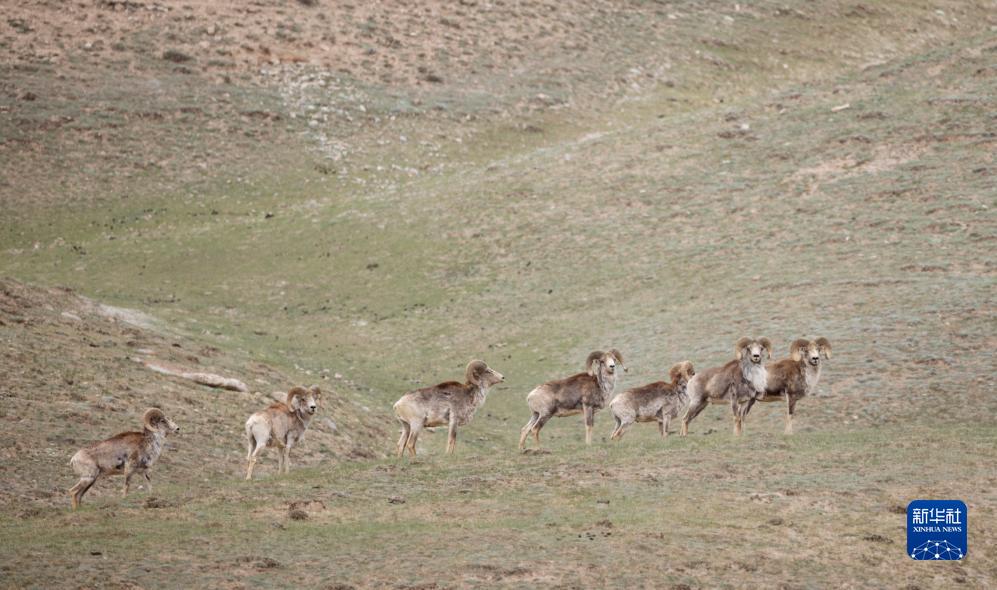6月30日,在新疆阿爾金山國家級自然保護區,西藏盤羊在山上眺望。
