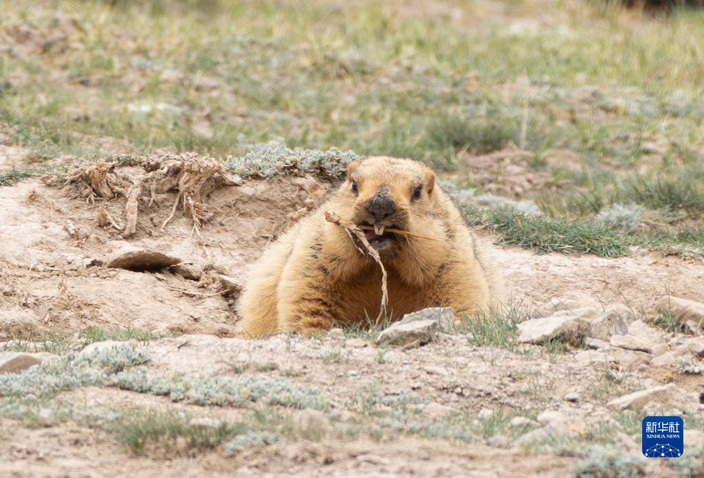 6月30日,在新疆阿爾金山國家級自然保護區,一隻喜馬拉雅旱獺正在進食。