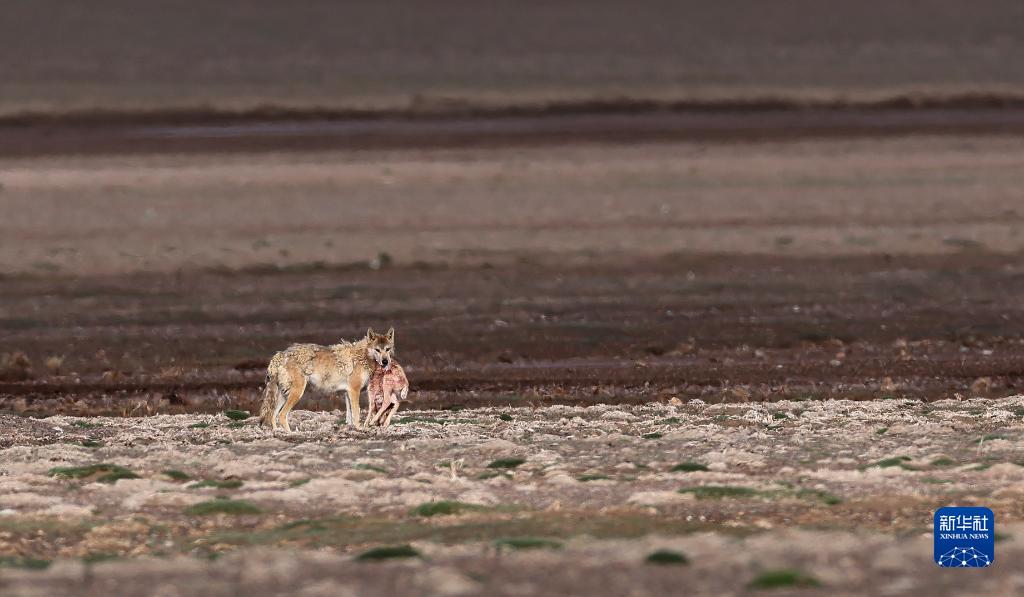 7月10日,在新疆阿爾金山國家級自然保護區,一隻狼叼着剛捕獲的藏羚羊幼崽。