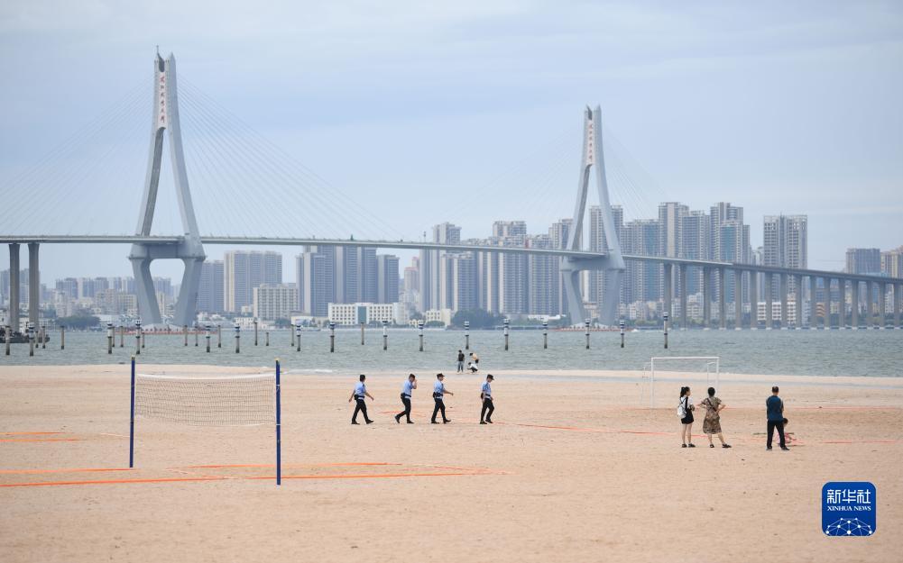 7月17日,在廣東湛江五環廣場的沙灘上,公安民警在執勤巡邏。