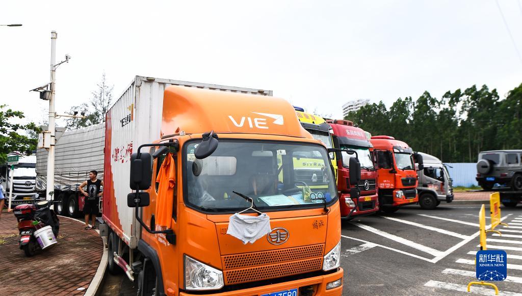 7月17日,不少貨車停放在金沙灣二路等地,等待颱風過後通過琼州海峽。