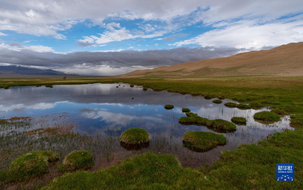 7月1日,在新疆阿爾金山國家自然保護區,庫木庫裏沙漠旁的一處濕地水面倒映出天空。