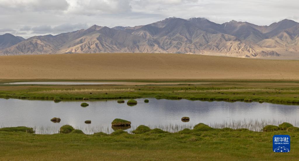 7月1日,在新疆阿爾金山國家自然保護區,庫木庫裏沙漠旁的一處濕地水面倒映出天空。